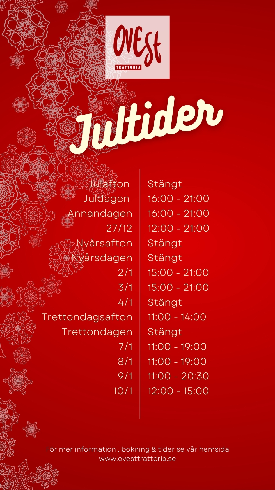 Önskar ni boka bord kan ni maila in till oss på ovesttrattoria@gmail.com eller ringa 016-51 81 88